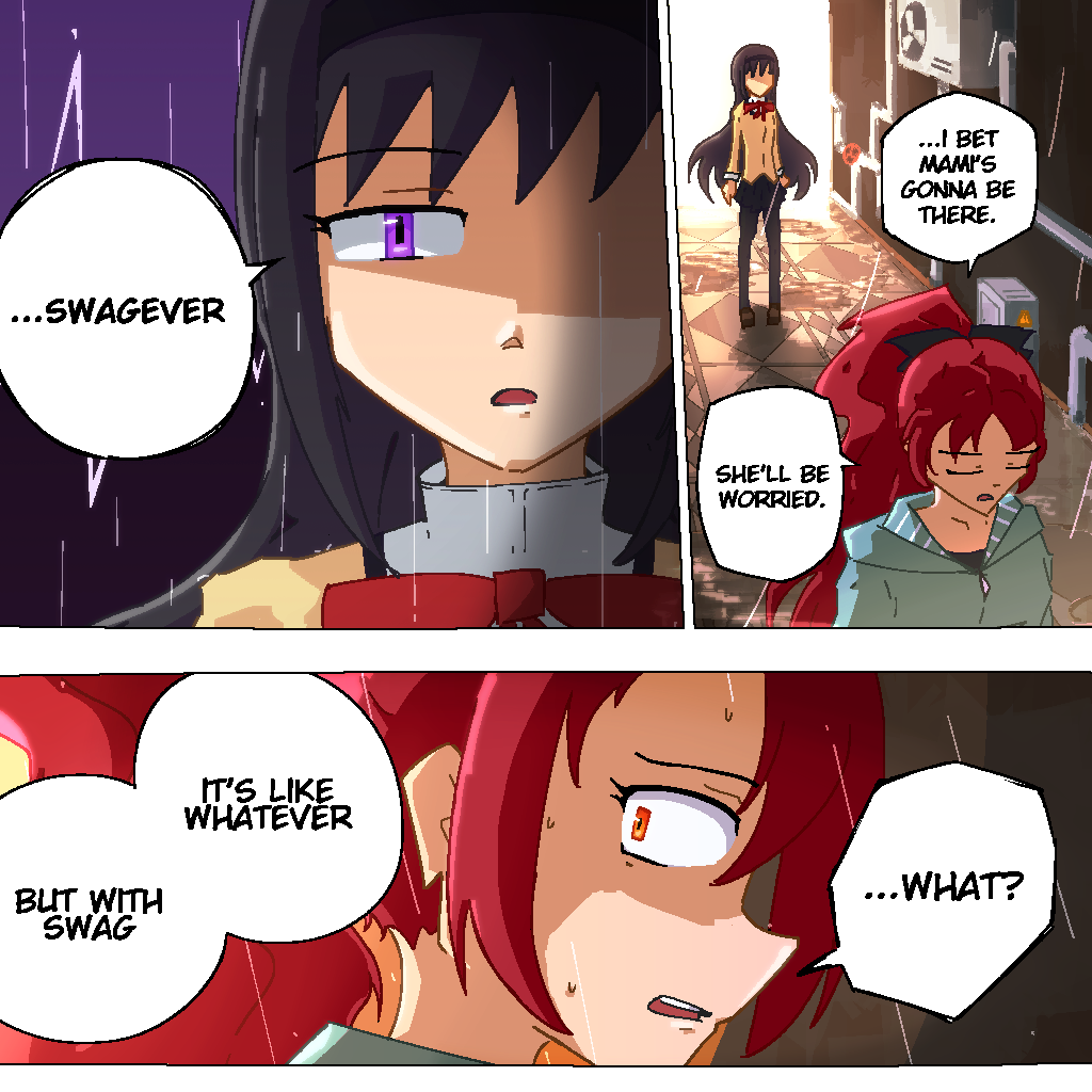 Nothing much to say about the final panel, besides maybe I should’ve made Kyouko’s head a tiny bit shorter and raised her nose a little. Her hairstyle differs somewhat from the one she has in the first panel because I used different references for the two shots (respectively the original edit and a shot from the show).